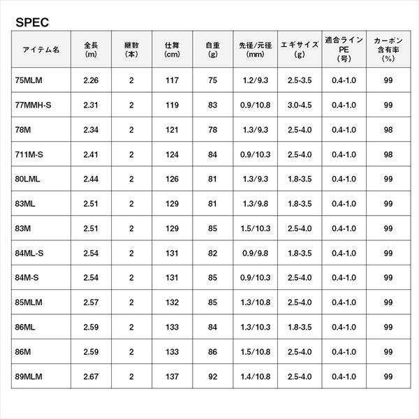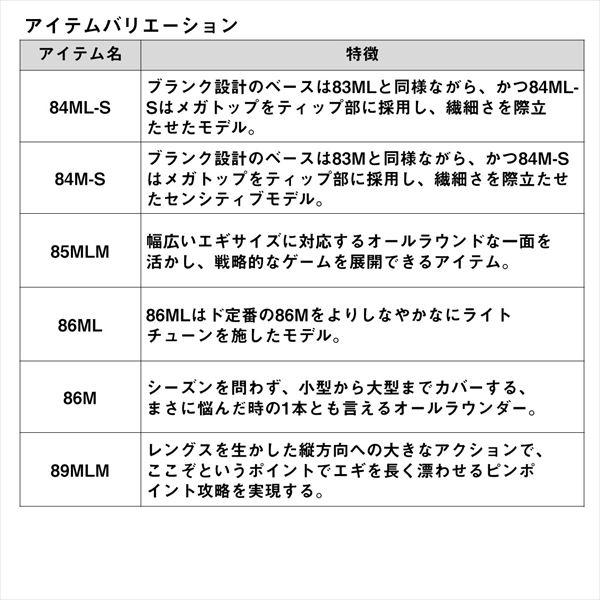 軽さにこだわりぬいた「EMERALDAS AIR 」。軽量性は大幅な感度の向上と疲れ知らずの操作性をもたらす。さらには、アングラーの動作をあらゆる角度からサポートし、今までの軽さの常識を塗り替える。■86ML・・・チューブラーティップの秋の定番モデル。86MLはド定番の86Mをよりしなやかなにライトチューンを施したモデル。8.6ftはキャスタビリティ、操作性共にバランスの取れたレングスで、秋に使用頻度の高い3号を中心に2.5号から3.5号までの幅広いエギサイズに対応。好みによりしなやかなロッドが好きなアングラーは、たとえMLとは言え、春エギングにおいても十分使用できる強度設定にしているため、安心して使用できる。 全長:2.59m 自重:84g 継数:2 仕舞寸法:133cm 先径/元径:1.3mm/10.3mm 対応エギサイズ:1.8~3.5g 適合ライン:PE 0.4~1.0号 カーボン含有率:99% ※実物と色が違って見える場合があります。あらかじめご了承下さい。