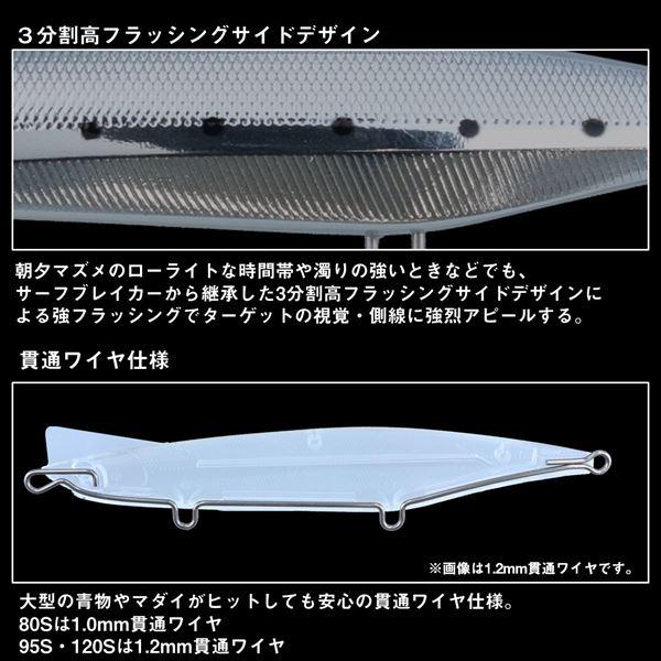 ヒラメ&マゴチからシーバス、青物まで幅広く狙える、超ぶっ飛びのバーサタイルヘビーシンキングペンシル!スローリトリーブではヒラメ&マゴチ、シーバスに有効なワイドテールスイングアクション、高速リトリーブでは青物に有効なイレギュラーローリングアクションにシフトチェンジ!圧倒的な飛距離を実現! サイズ:95mm 標準自重:35g 有効レンジ:0.5~∞ タイプ:ヘビーシンキング テスト飛距離:MAX107m、Ave104.3m 標準装備フック:♯4トレブル 標準装備リング:♯4 アクション:ワイドテールスイング&イレギュラーロール ※実物と色が違って見える場合があります。あらかじめご了承下さい。