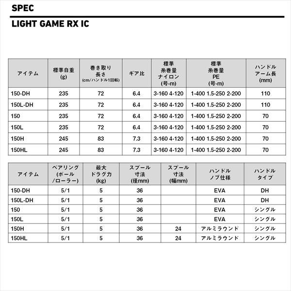 HYPER ARMED HOUSING(AL)だから高剛性。PE2号-200mと豊富なICカウンター搭載で軽量&コンパクトな手巻きリール。幅広いライトゲームに対応できる汎用モデル。高負荷でもパワフルな巻上げが可能。さらにPE2号-200mと豊富なラインキャパでタチウオ、真鯛、アジ、サバ、イサキ、ヒラメ、タイラバ、ライトジギング、イカメタル等、様々なシーンで活躍できるLIGHT GAME RX IC。ギア比7.3(巻き取り長さ83cm)のライトジギング対応モデル。 重量(g):245 巻取長さ/ハンドル1回転(cm):83 ギア比:7.3 巻糸量(ナイロン):3号-160m、4号-120m 巻糸量(PE):1号-400m、1.5号-250m、2号-200m ベアリング:5/1 ドラグ力(kg):最大5 ハンドルアーム長(mm):70 スプール寸法(幅mm):36 ハンドルタイプ:シングル ハンドルノブ仕様:アルミラウンド ボディ素材:アルミ ※実物と色が違って見える場合があります。あらかじめご了承下さい。