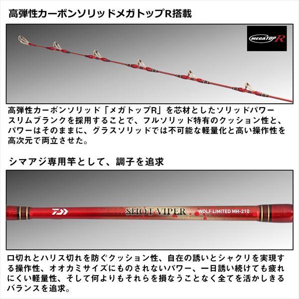 クッション性、操作性、パワー、軽量性、全てを活かしきるバランスを追求したシマアジ専用竿。■MH-210・・・錘100号を使用する遠征シマアジモデル。糸絡みしにくいゴールドIP LCガイドを装備。携行性の良いフェルールジョイント仕様。 全長:2.10m 重量(g):315 継数:1 仕舞寸法(cm):165 錘負荷(号):40-120号 先径/元径(mm):1.3/17.9 継ぎ方式:フェルールジョイント カーボン含有率(%):78 ※実物と色が違って見える場合があります。あらかじめご了承下さい。