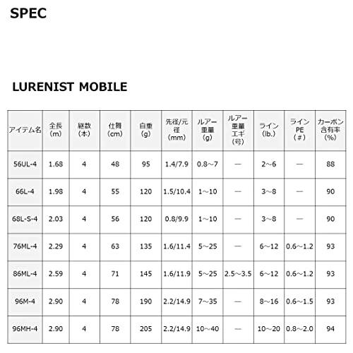 ルアーフィッシングエントリーロッドのLURENISTの性能を落とすことなく、携帯性のよい4ピース仕様にしたモバイルモデル。自転車やバイク釣行をはじめ、キャンプのついで、予備ロッドなど、様 な使い方で気軽なルアーフィッシングをサポートする。