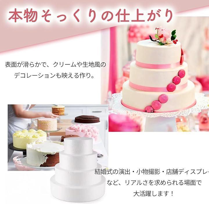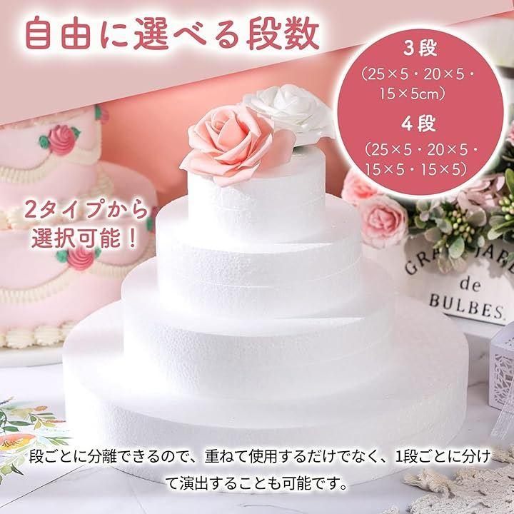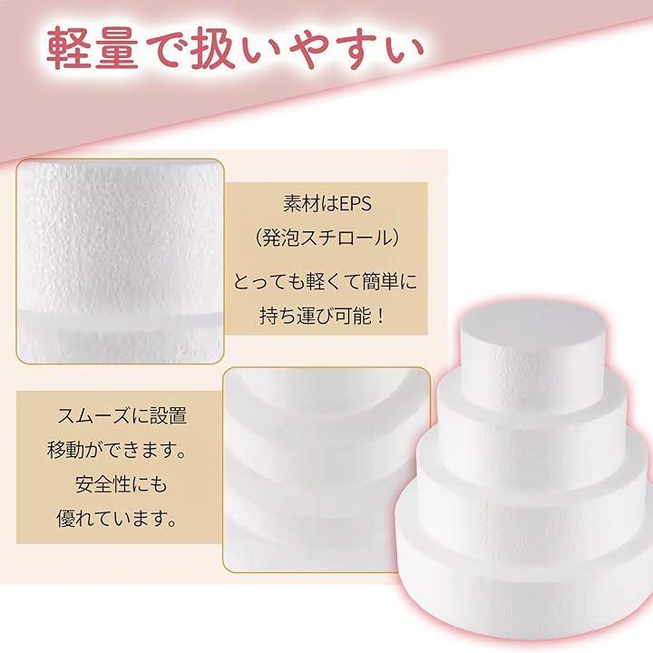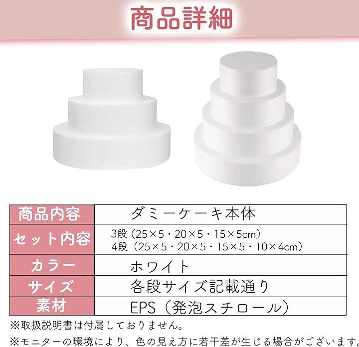 「商品内容」 ダミーケーキ本体「セット内容」 3段(25x5、20x5、15x5cm)または4段(25x5、20x5、15x5、10x4cm)「カラー」 ホワイト「サイズ」 各段サイズ記載通り「素材EPS(発泡スチロール)*モニターの環境により、色の見え方に若干差が生じる場合がございます。