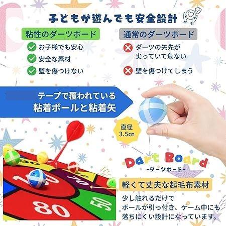「子どもが遊んでも安心の安全設計」 尖った金属のダーツを使わず、柔らかい起毛布ボードとテープ仕様の粘着ボール&粘着矢を採用した安全設計のダーツボードです。