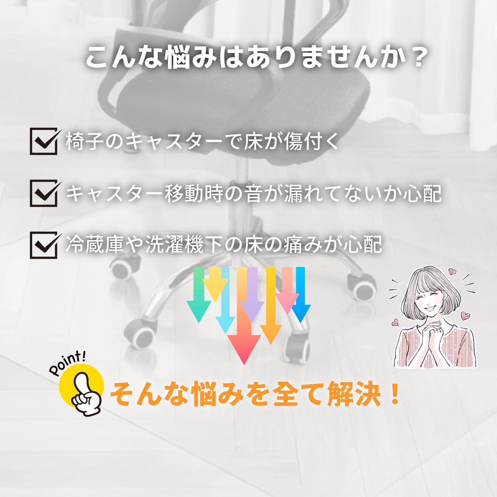 キャスター付きチェアや椅子の重みで起こりがちな床の傷・へこみ・汚れをしっかりガード。