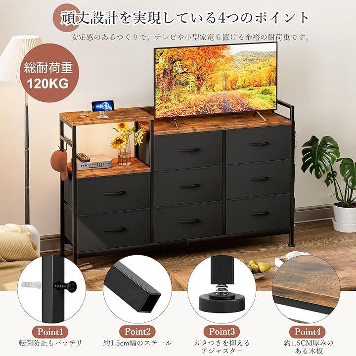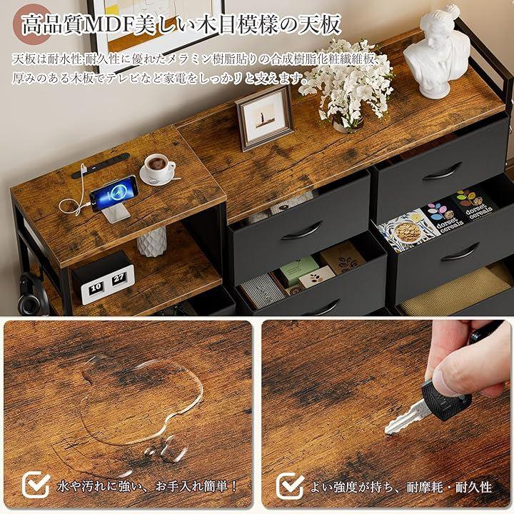 「便利なコンセント付きの天板+2段棚&6杯引き出し」チェスト天板の上にコンセント口2口とUSB&TypeCポートを備え、デスクライトの電源やスマートフォンの充電などを手近なところで取ることができるので便利です。