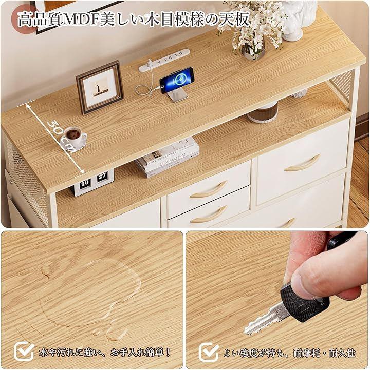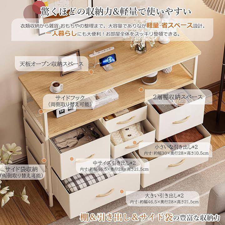 「便利なコンセント付き天板+2段棚&6段引き出し」天板にはコンセント2口とUSB/Type-Cポートを装備。