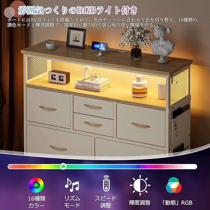 「雰囲気を彩るRGBライト付き」チェスト上部の棚ボードに内蔵されたLEDライトが、パーティーやゲームを一瞬で特別な空間に変えます。