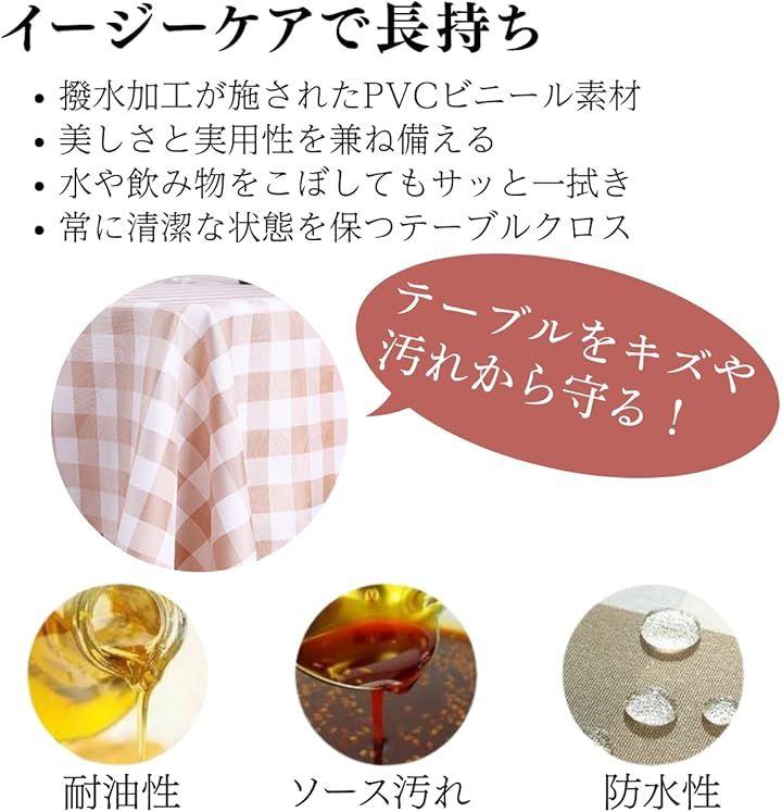 「機能性」撥水加工が施された塩化ビニール製のテーブルクロス ギンガムチェックは、水や飲み物をこぼしてもサッと拭くだけで清潔を保てる便利さが魅力。