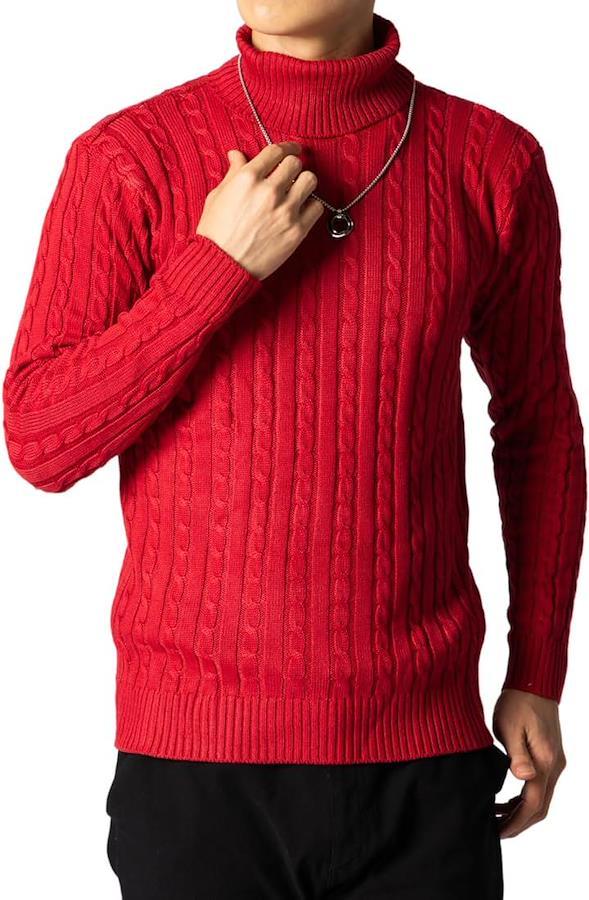 「上品さとスタイリッシュさを兼ね備えた」高いデザイン性とスリムなシルエットが特徴のケーブル編みニットタートルネックセーター。