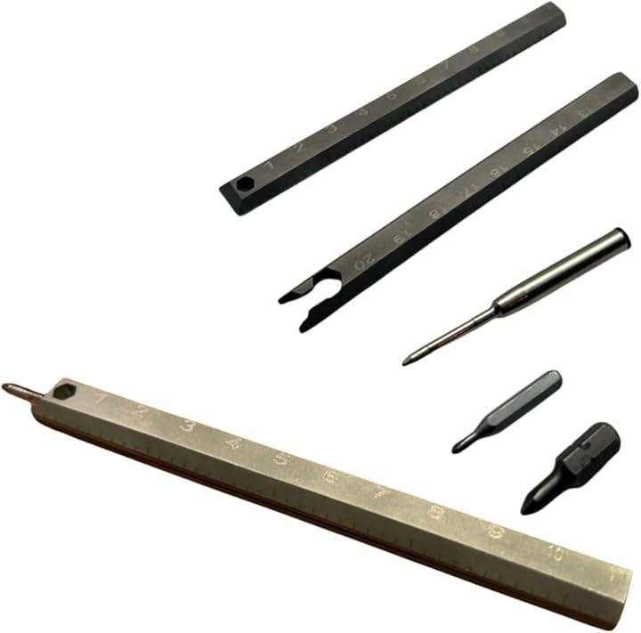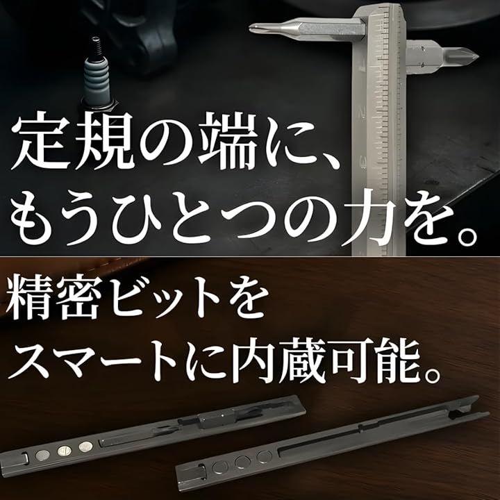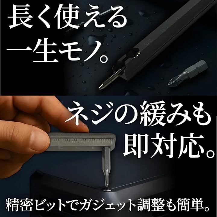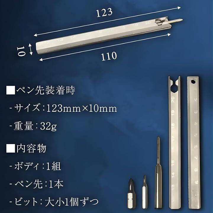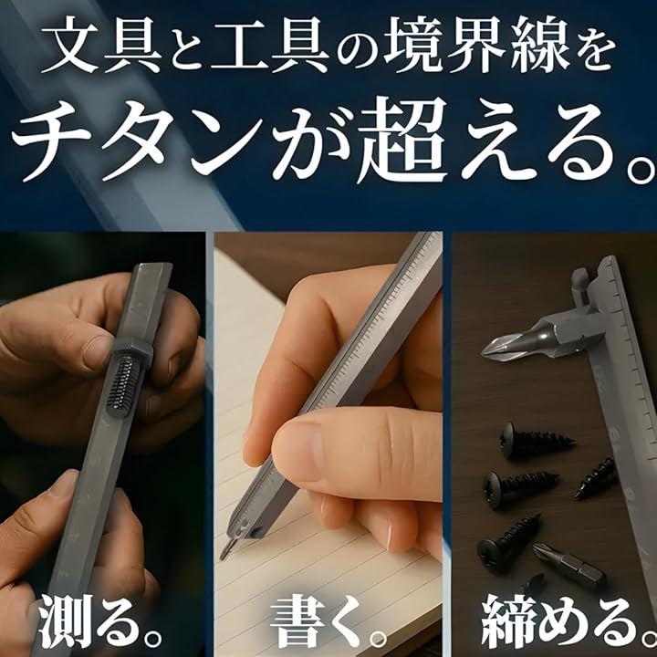 「多機能設計|1本で“書く・測る・締める”が完結」 ペン・定規・ドライバーの3機能を搭載したタクティカル仕様。