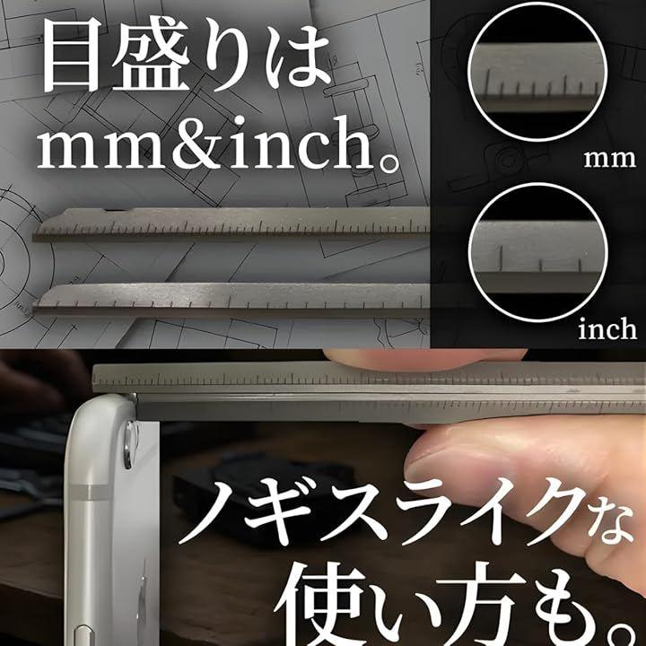 定規部分はミリ(mm)単位で精密に刻印されており、図面やスケッチ、作業現場での簡易測定に最適です。