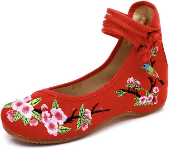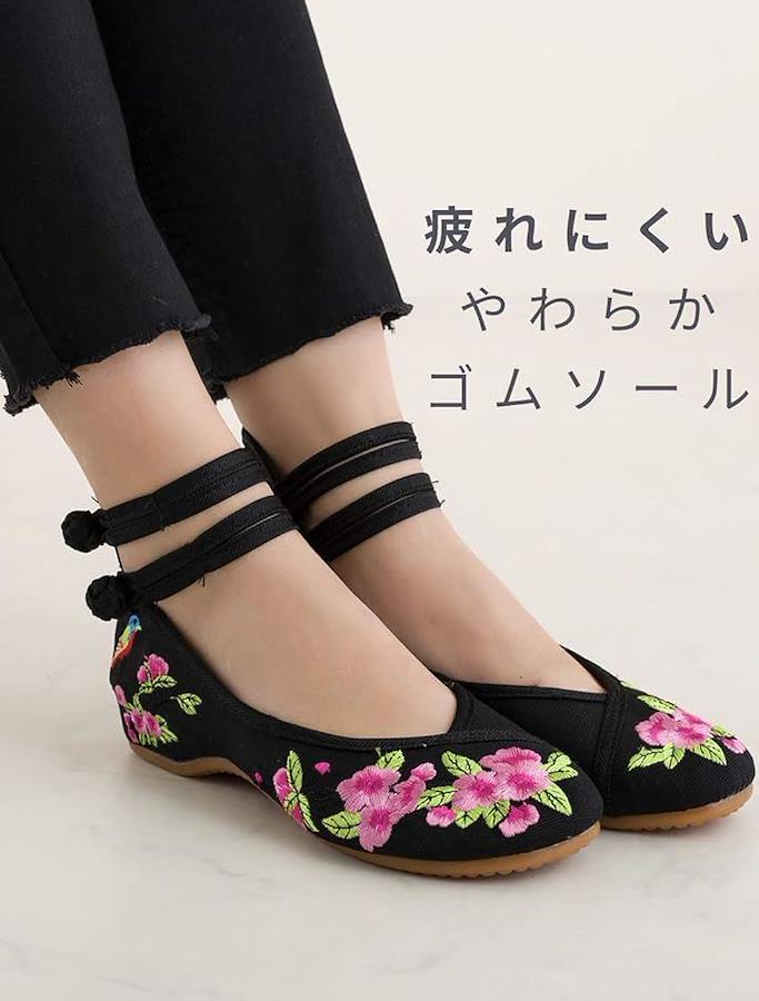 アジアンな雰囲気がとっても可愛い花柄デザイン、丸っこいフォルムが優しいシルエットの刺繍入りシューズ。
