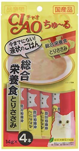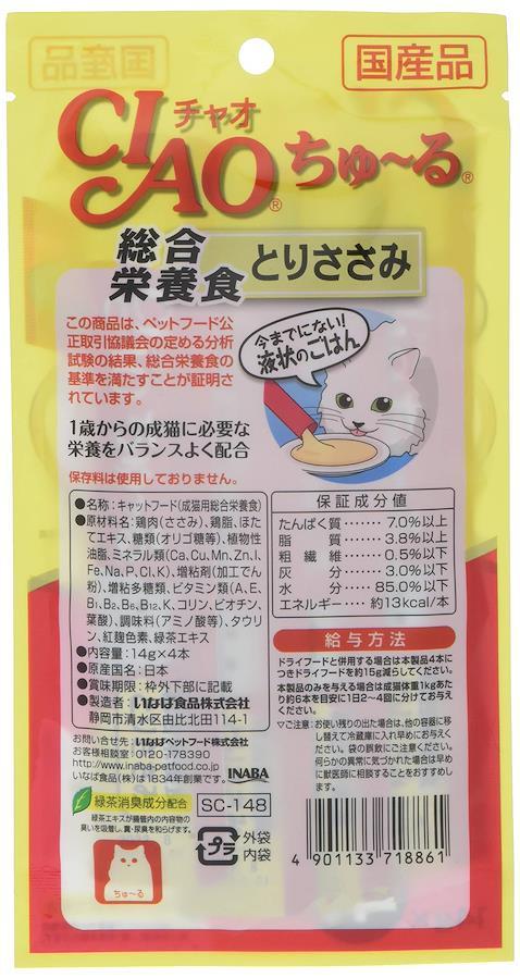 鶏肉(ささみ)、鶏脂、ほたてエキス、糖類(オリゴ糖等)、植物性油脂、ミネラル類(Ca、Cu、Mn、Zn、I、Fe、Na、P、Cl、K)、増粘多糖類、ビタミン類(A、E、B1、B2、B6、B12、K、コリン、ビオチン、葉酸)、調味料(アミノ酸等)、タウリン、紅麹色素、緑茶エキス