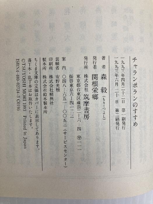 ■商品詳細■ 商品名・チャランポランのすすめ (ちくま文庫 も 4-6) 筑摩書房 森 毅/ ■商品状態■表紙にスレ、ヤケ、天地小口にスレ、強いシミ、ヤケ、本にスレ、ヨレ、ヤケ、があります。本を読むことに支障はございません。※注意事項※■毎商品チェック後出品しておりますが、中古品ということもあり、多少の書き込み等のチェック漏れがあった際はご容赦下さい。■付録等の付属品がある商品の場合、記載されていない物は『付属なし』とご理解下さい。■併売販売をしているため、在庫切れの場合はキャンセルとなります。予めご了承ください。