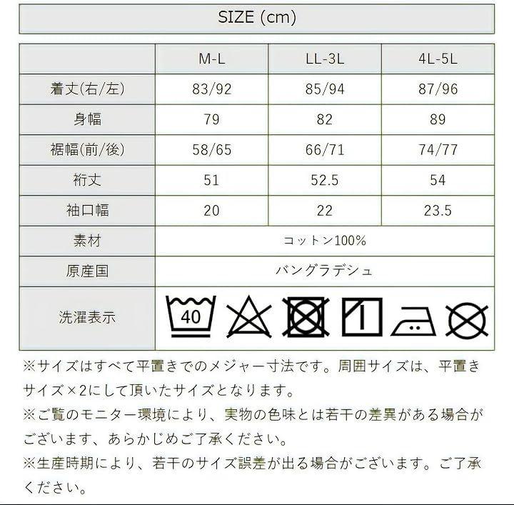 [M-Lサイズ]着丈(右/左):83/92cm、身幅:79cm、裾幅(前/後):58/65cm、裄丈:51cm、袖口幅:20cm[LL-3Lサイズ]着丈(右/左):85/94cm、身幅:82cm、裾幅(前/後):66/71cm、裄丈:52.5cm、袖口幅:22cm[4L-5Lサイズ]着丈(右/左):87/96cm、身幅:89cm、裾幅(前/後):74/77cm、裄丈:54cm、袖口幅:23.5cm