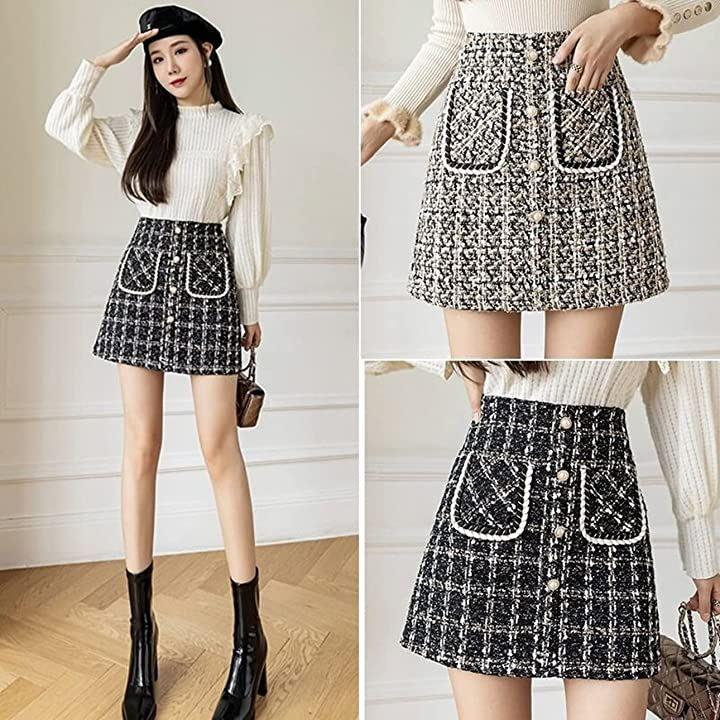 Tweed Skirt Mini A-Line Button Pencil Pocket Thick Ladies Plaid