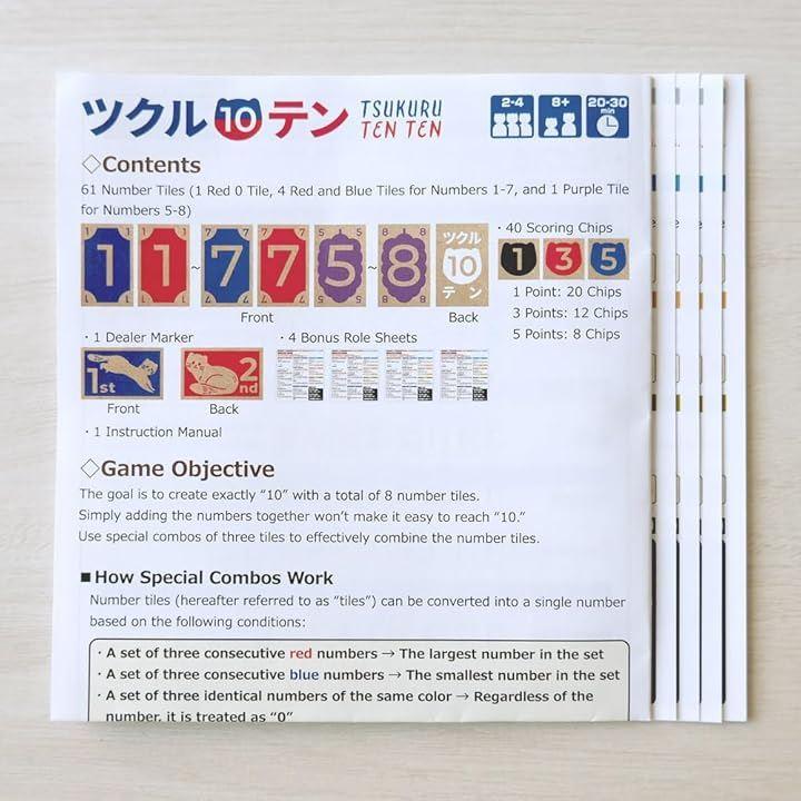 このボードゲームは数学パズルに似ており、3つの特別な組み合わせ(数字圧縮)を使い、手札8枚でできるだけ早く合計を10にすることを目指します。