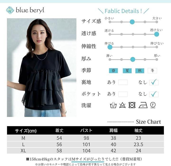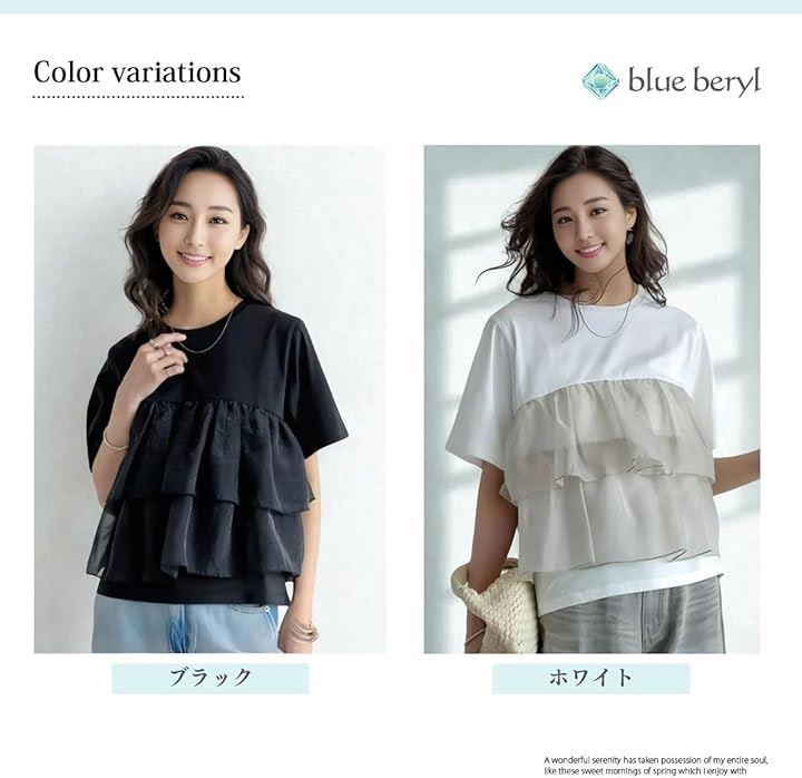 「異素材ミックスで叶える軽快な着心地」 さらりとした手触りのポリエステル素材を使用したカットソー生地に、透け感のある軽やかなフリルをドッキング。