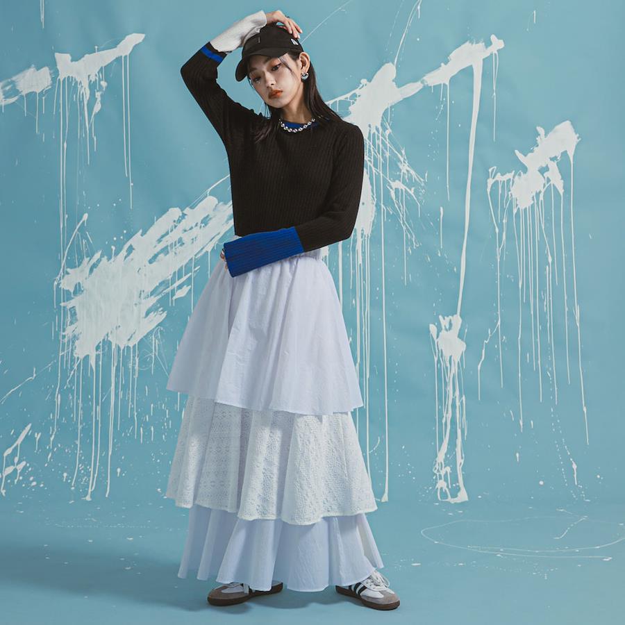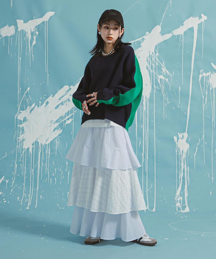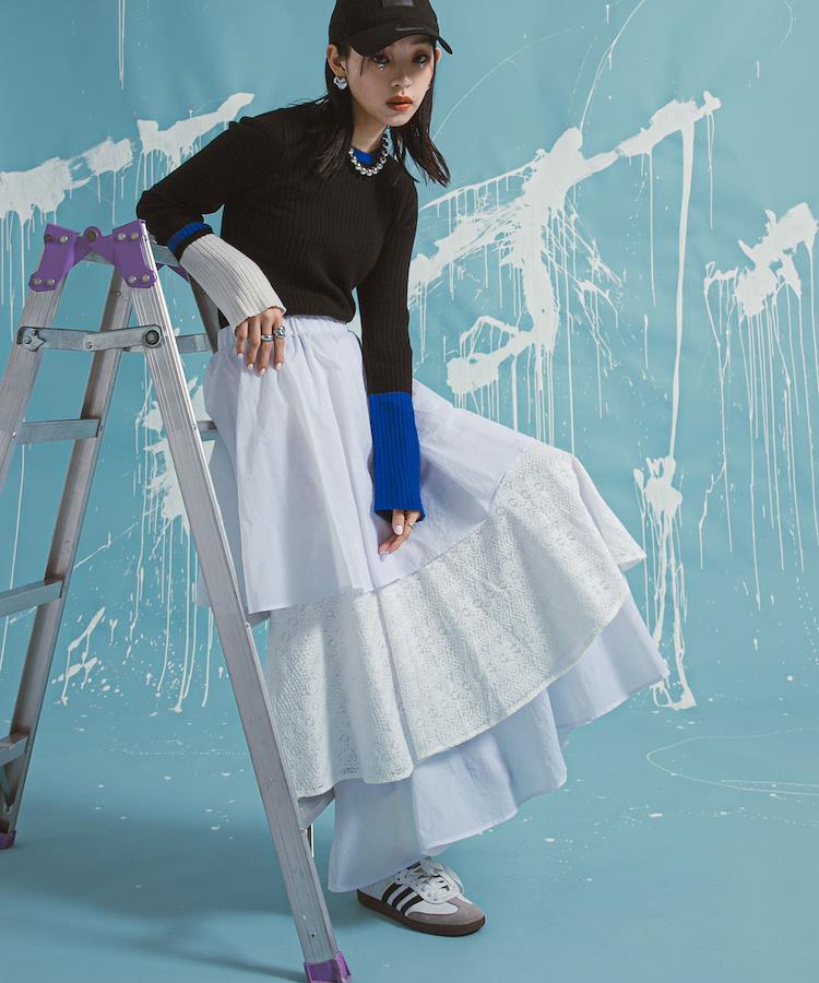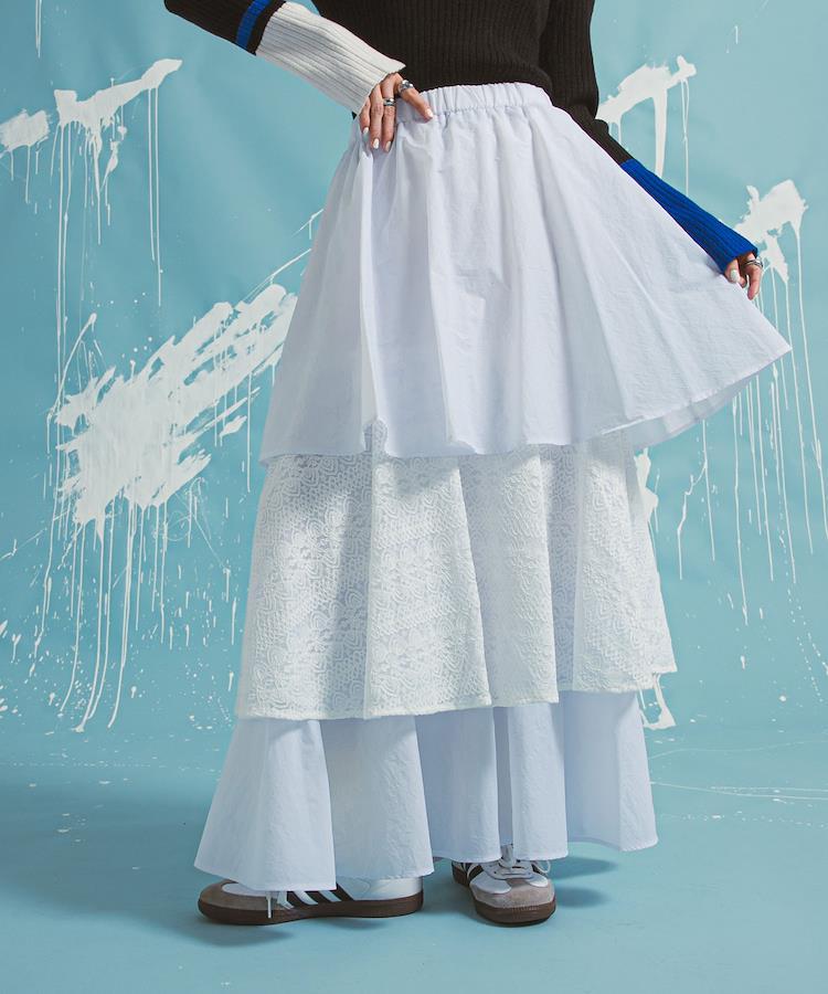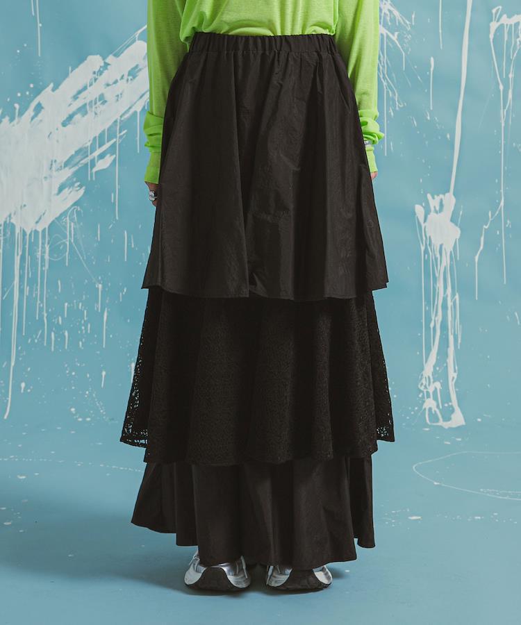 2段目のティアードには異素材のレースをドッキングすることで、カジュアルかつこなれた印象に。