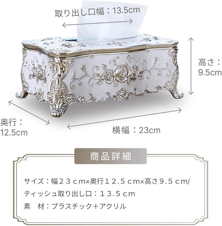 「商品詳細」サイズ:幅23cmx奥行12.5cmx高さ9.5cm/ティッシュ取り出し口13.5cm 素材:プラスチック+アクリル