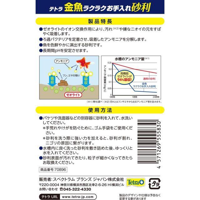 商品紹介●キレイが長続きする観賞魚用底砂●コケと汚れの元を94%カット●ゼオライトのイオン交換作用により、汚れや嫌なにおいの元を素早く吸着。●ろ過バクテリアを定着させ、吸着したアンモニアを分解します。●長期間pHを安定させます。●魚を色鮮やかに演出する砂利です。使用方法観賞魚水槽専用の砂利です。他の目的に使用しないでください。使用前に良く水洗いしてください。