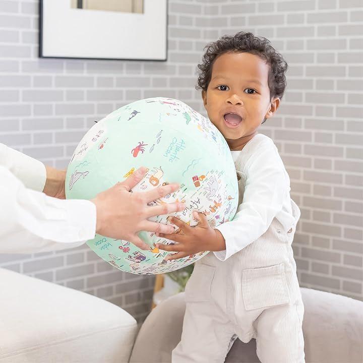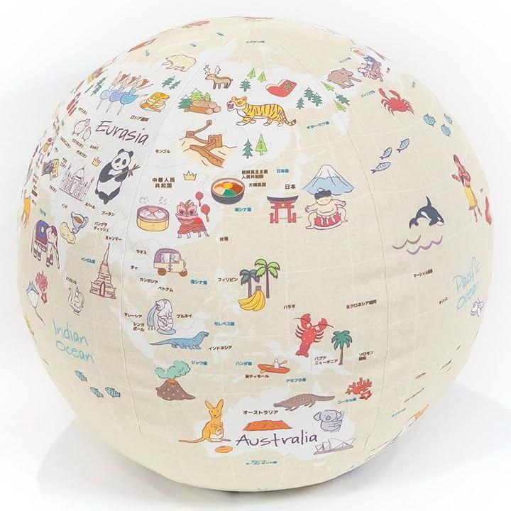 「世界の可愛らしいイラスト」 優しい肌触りの布製の地球儀に、それぞれの地域にぴったりな魅力的なイラストを散りばめました。