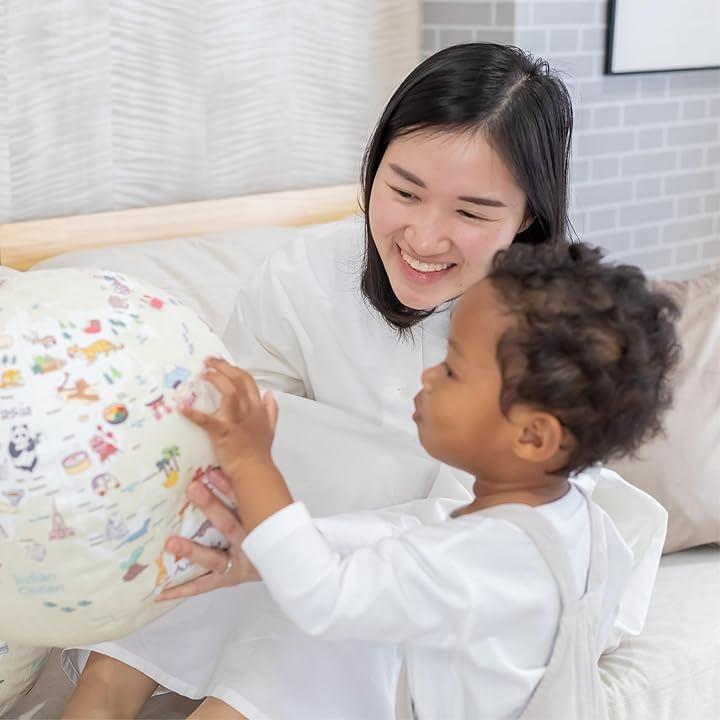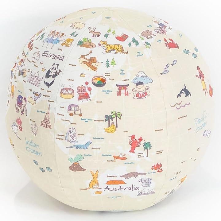 「世界の可愛らしいイラスト」 優しい肌触りの布製の地球儀に、それぞれの地域にぴったりな魅力的なイラストを散りばめました。