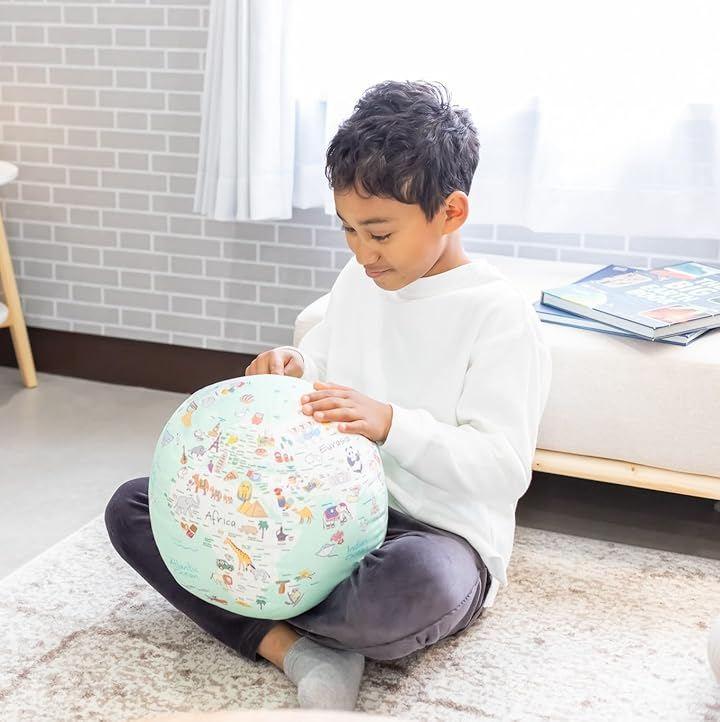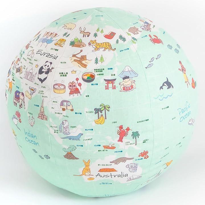 「世界の可愛らしいイラスト」 優しい肌触りの布製の地球儀に、それぞれの地域にぴったりな魅力的なイラストを散りばめました。