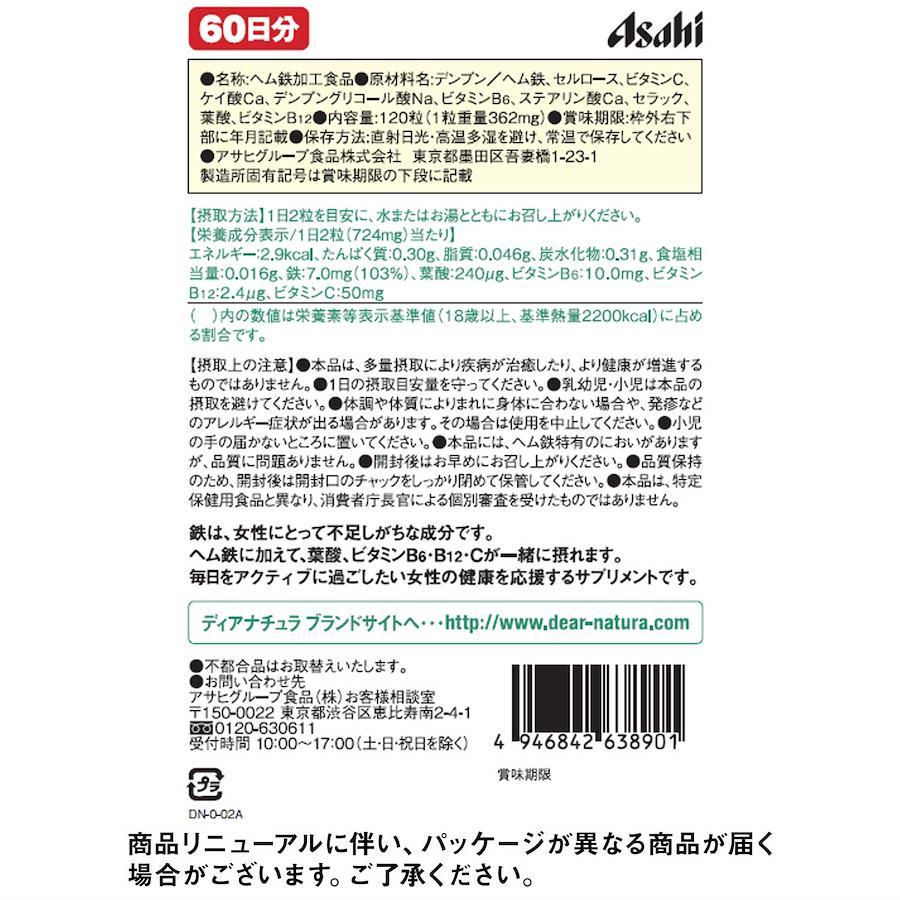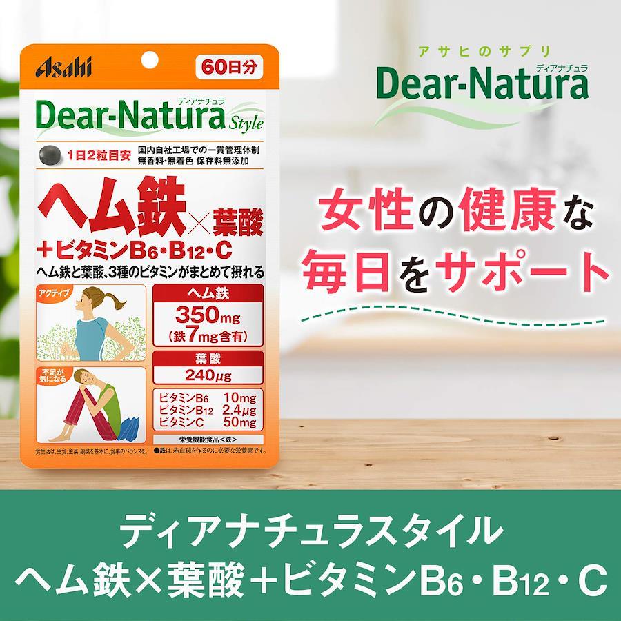 Dear-Natura Style Heme Iron x Folic Acid + Vitamins B6, B12, and C, 120 Tablets (60-Day Supply) by Asahi Supplement Dear-Natura, Produced in Japan