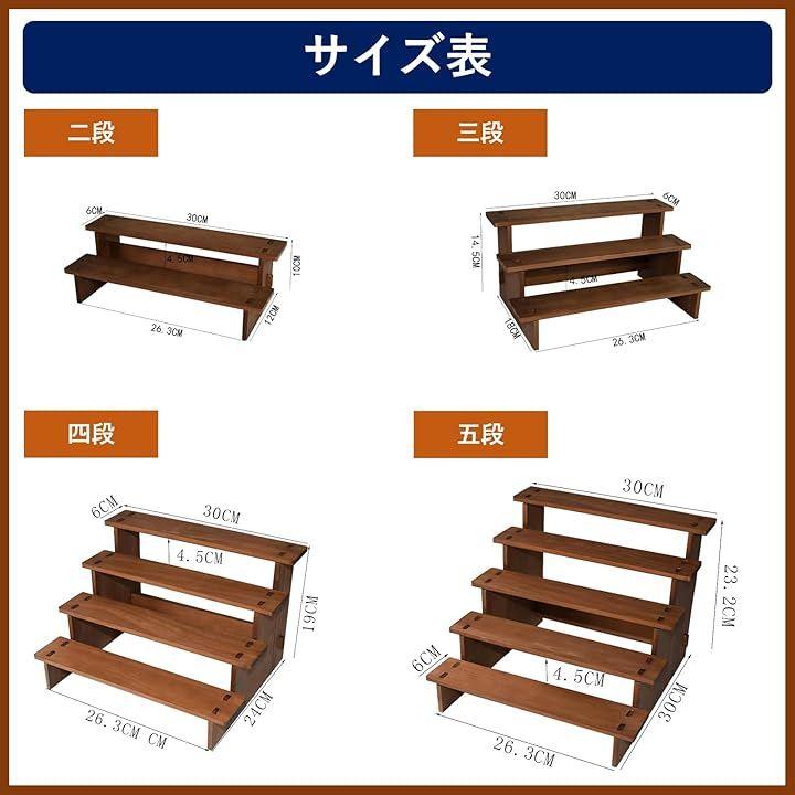 「サイズ」二段:横幅30cmx奥行12cmx高さ10cm、 三段:横幅30cmx奥行18cmx高さ14.5cm、 四段:横幅30cmx奥行24cmx高さ19cm、 五段:横幅30cmx奥行30cmx高さ23.2cm