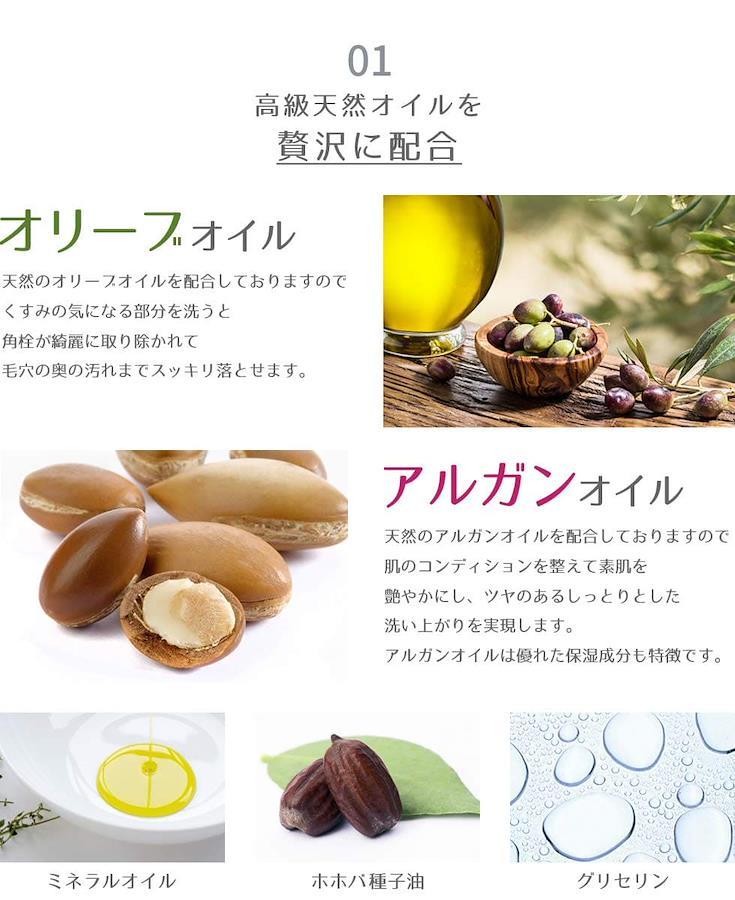 〇商品説明「保湿成分 天然オリーブオイルとアルガンオイルをぜい沢に配合した、お風呂で使えるお肌にやさしいクレンジングオイルです。」*オリーブオイル…スペイン生まれのオリーブの果実から得られるオイルです。お肌になじみやすく、しっとりとしたお肌に導きます。*アルガンオイル…モロッコ生まれのアルガンツリーの実から採れるオイルです。「モロッコの黄金」と讃えられ、高い保湿力があります。