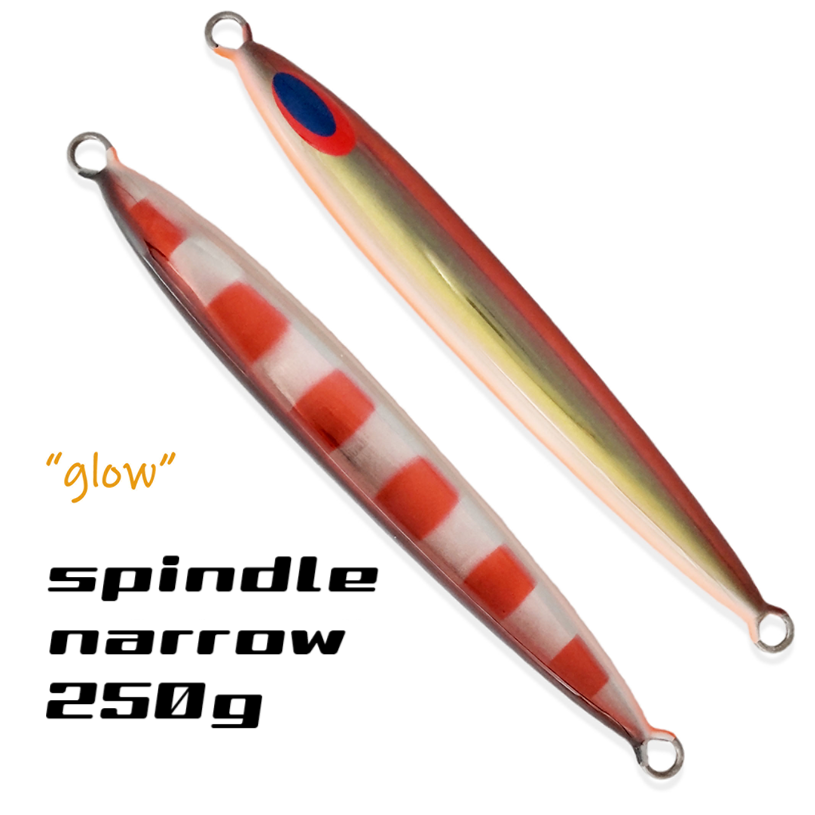スピンドルの強みでもある、上げ下げ時のアピールを抑えたナチュラルアクションでの喰わせ。 スピンドルナローはこの強みに、抜け過ぎない程よい抜け感でよりスピード感のある、またはメリハリのある巻きのアクションを比較的容易に演出。 青物、根魚問わず、興味を持った魚に口を使わせます。 フロント重心がパラレル(平行姿勢)フォールを容易にし、フォールアクションの自走を抑制するので、太刀魚など捕食が下手で歯のある魚の、ミスバイトによるリーダー切れも減らしてくれます。巻きの釣りはスピード感もあり、上げ下げアクションを自在に組み合わせる等、得られる操作感は、使う楽しさを感じるジグの一つです。