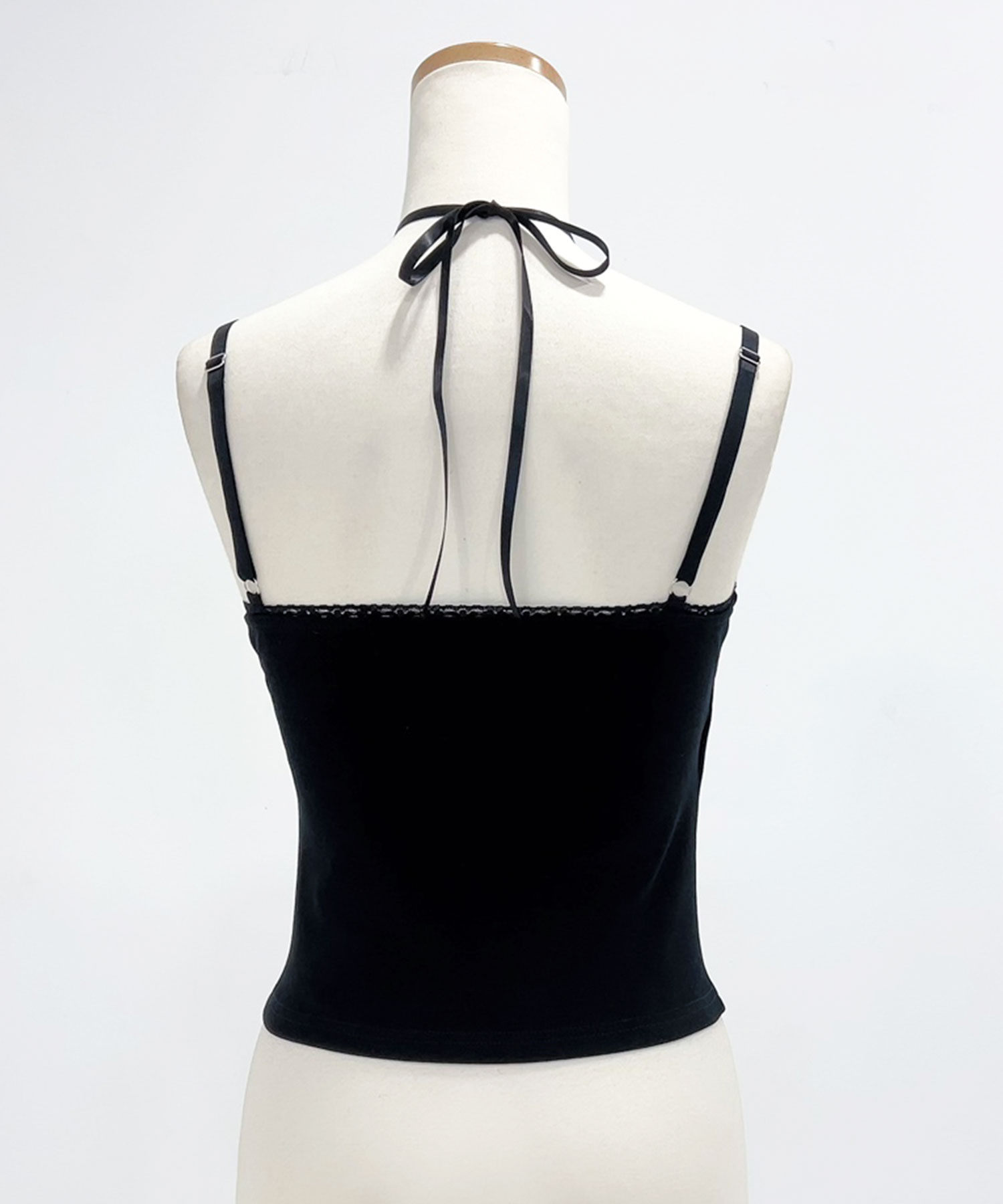 キャミタイプのホルターネック紐はクロスして後ろでリボン結びしても可愛いし、前に垂らしてチョーカー風にしてもOK!