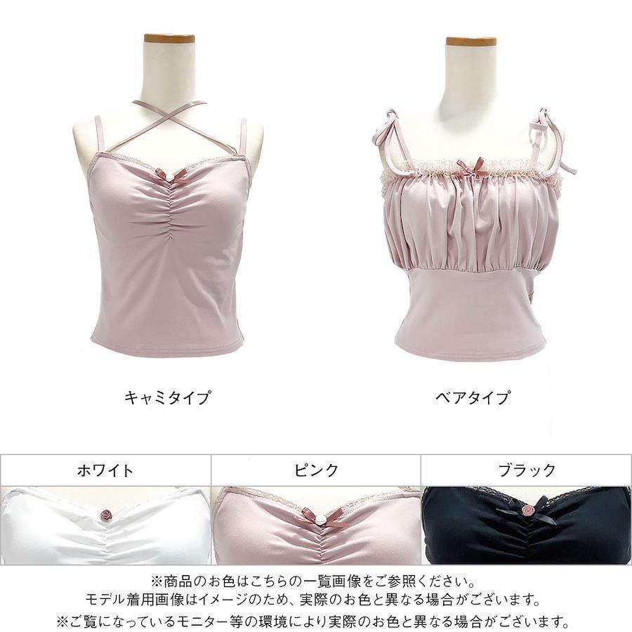 キャミソールタイプは、前中心にバラリボンが付いており、さらにホルターネック紐付きでトレンド感のあるデザイン。