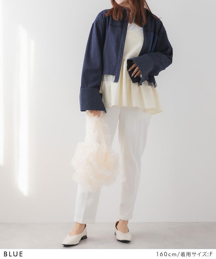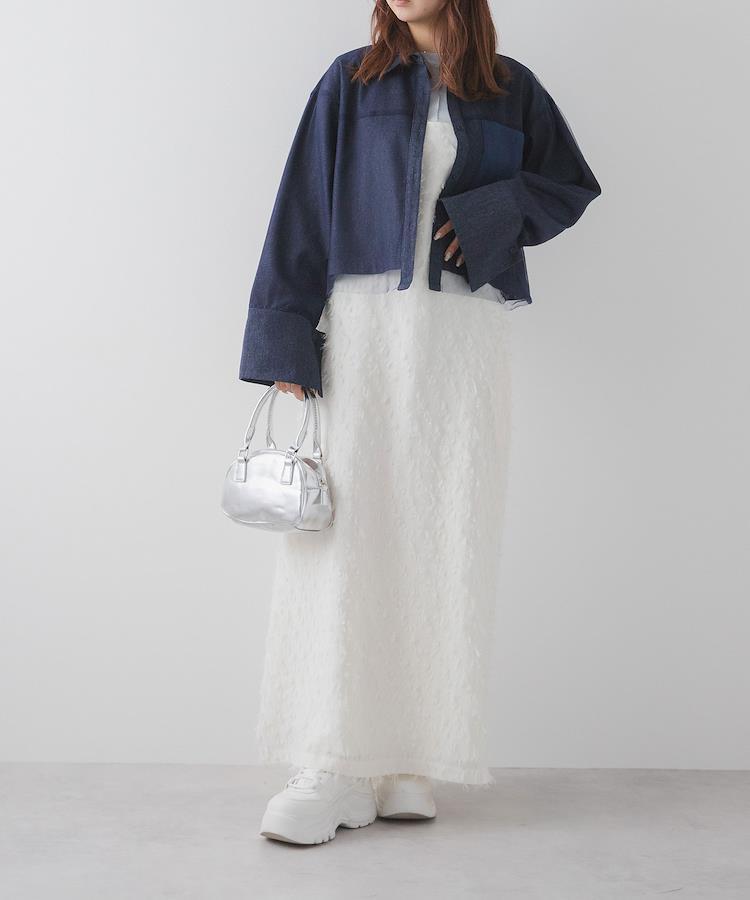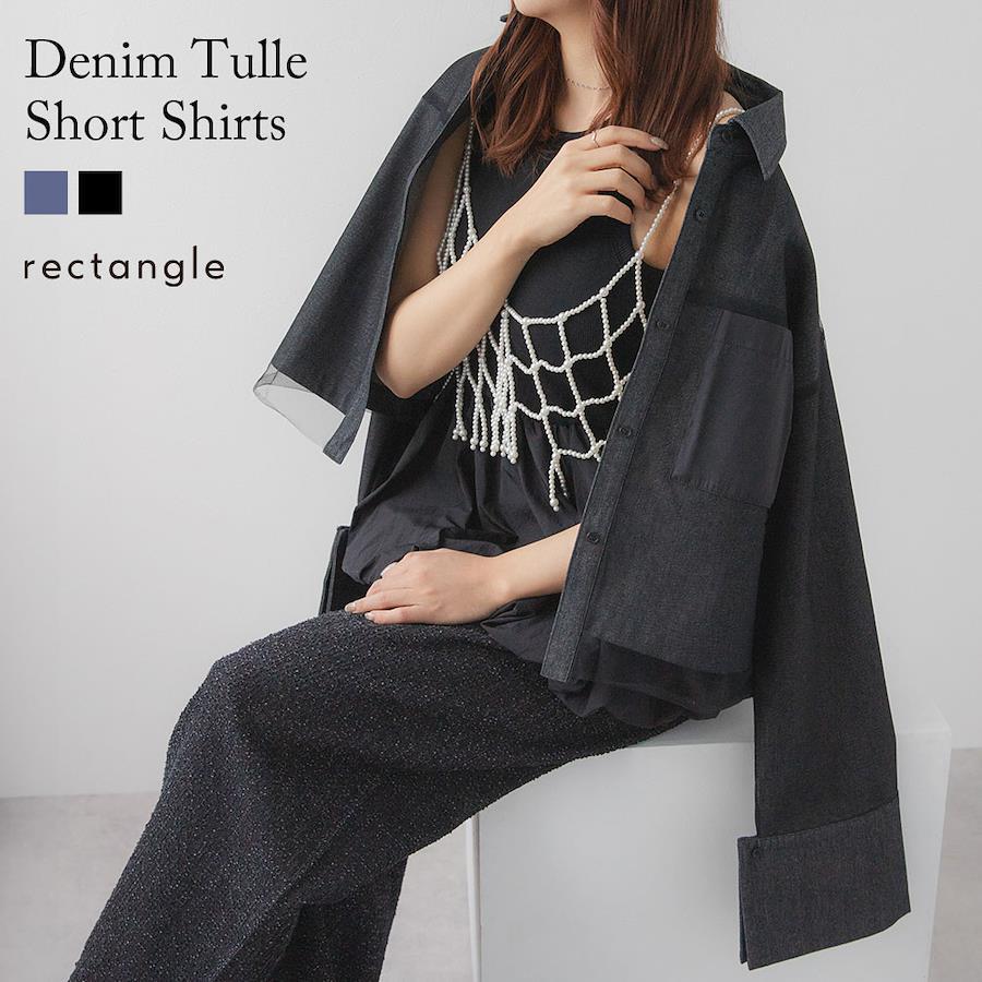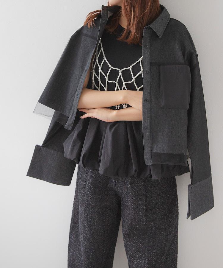 クールなデニム素材と柔らかなチュールの絶妙な組み合わせが、トレンド感あふれる一着。