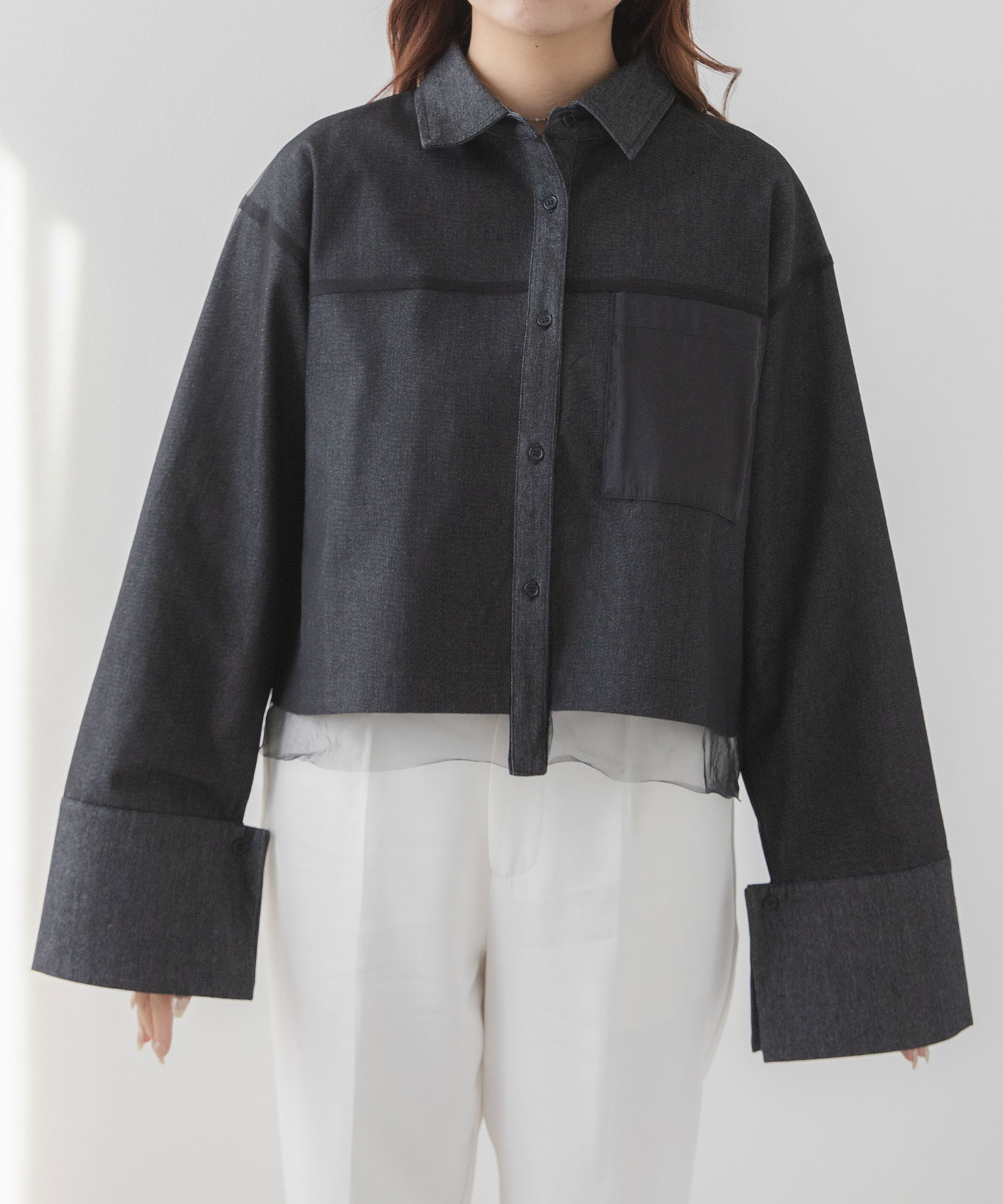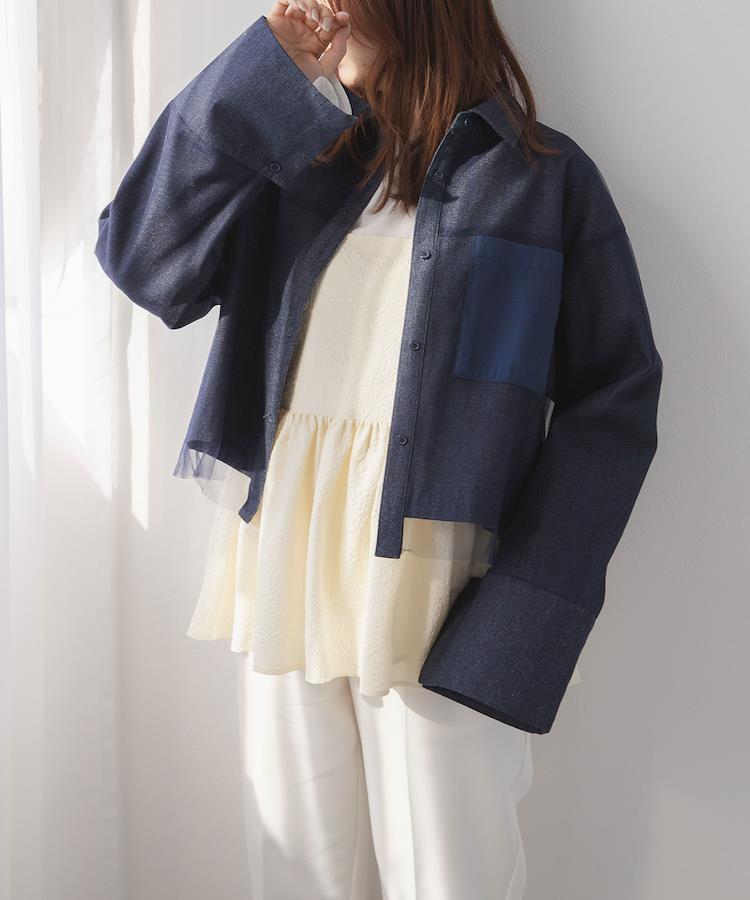 繊細なチュールがレイヤードされたデニムショートジャケット。