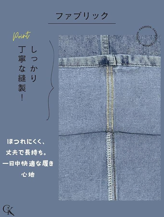 「デイリーユースにぴったりのデニム素材」程よく柔らかいデニム生地で、デイリーに使いやすく、動きやすさと耐久性を両立。