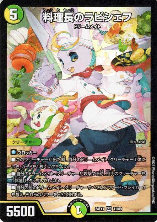 通常1-5営業日で発送【新品未開封品】デュエルマスターズTCG 「超感謝祭 ファンタジーBEST」(DM24-EX1)収録 ■カード名:料理長 のラビシェフ ■Card Name:Rabichef the Head Chef ■レアリティ:スーパーレア ■種類:クリーチャー ■文明:光/自然文明 ■種族:ドリームメイト ■パワー:5500 ■コスト:(5) [特殊能力] ■ブロッカー このクリーチャーが出た時、自分のドリームメイト・クリーチャー1体につき、カードを1枚引いてもよい。 自分のドリームメイト・クリーチャーが攻撃する時、相手のクリーチャーを1体選び、タップしてもよい。 自分の他のドリームメイト・クリーチャーすべてに「パワード・ブレイカー」を与え、それらのパワーを+3000する。