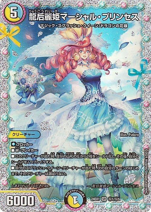 通常1-5営業日で発送【新品未開封品】デュエルマスターズTCG 「超感謝祭 ファンタジーBEST」(DM24-EX1)収録 ■カード名:龍后麗姫マーシャル・プリンセス ■Card Name:Marshall Princess, Dragon Queen Beautiful Princess ■レアリティ:スーパーレア ■種類:クリーチャー ■文明:光/水文明 ■種族:マジック・スプラッシュ・クイーン/ドラゴンの花嫁 ■パワー:6000 ■コスト:(5) [特殊能力] ■ブロッカー ■W・ブレイカー このクリーチャーが出た時、自分の山札の上から2枚をシールド化し、その後、自分のシールドを1つブレイクする。 自分のスプラッシュ・クイーン・クリーチャーが出た時、次の自分のターンのはじめまで、そのクリーチャーは選ばれない。