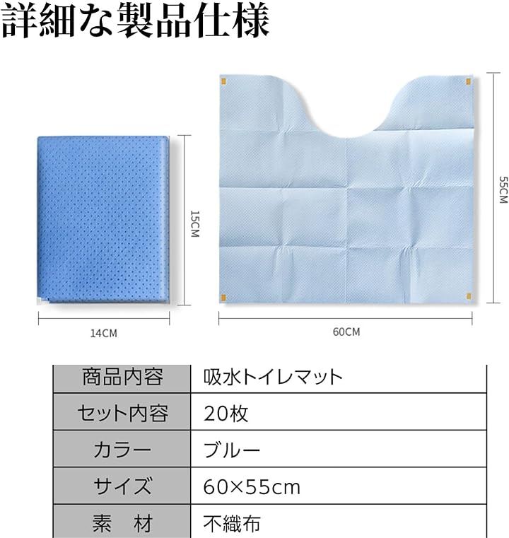 「商品内容」吸水トイレマット 「セット内容」20枚 「カラー」ブルー 「サイズ」約60x55cm 「素材」不織布 *モニター環境により、実際の色味と異なる場合があります。
