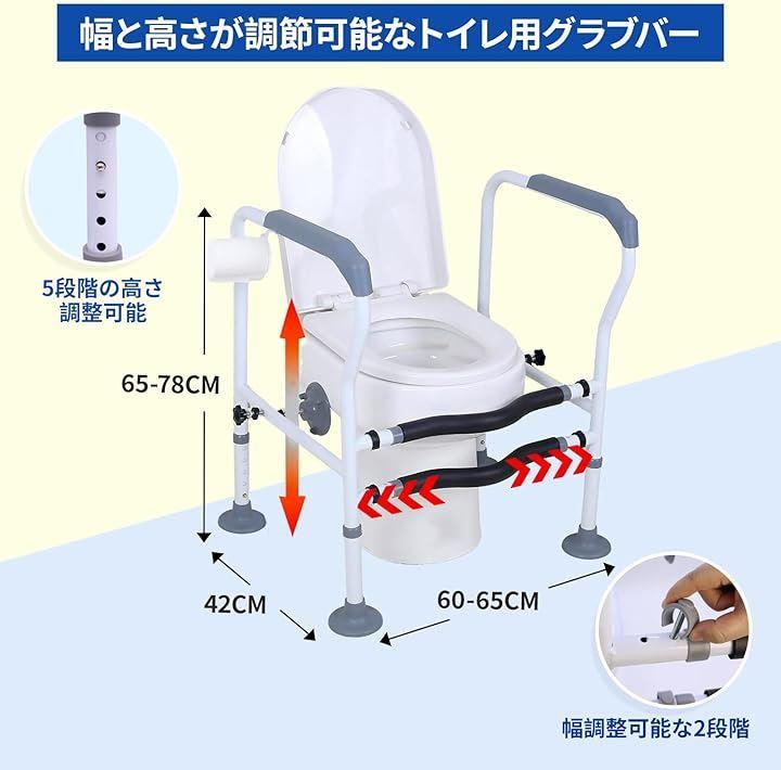 トイレットペーパーフック付き介護用トイレ: 当社のトイレ介護用手すりは、高さ65-78cm、前面幅60-65cm、側面幅42cmで、高さ調節可能なステップ5段、幅調節可能なステップ3段に加え、トイレットペーパーを掛けられるフック付きで便利です