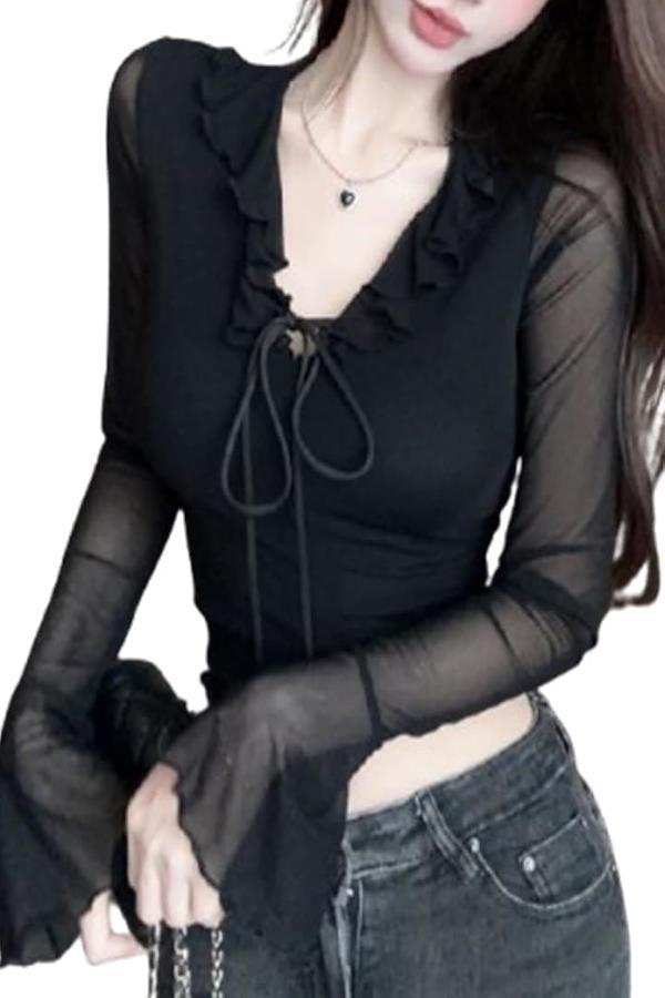 透け感のあるシアー袖がさりげなく肌を見せて、軽やかさと上品さを両立しています。