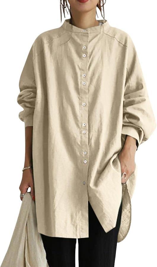 Women's Long Shirt Dress - Stylish, Long Sleeved, Stand Collar, Solid Color, Relaxed Fit, Cute, Basic, Classic, Ladies, Moms, Front