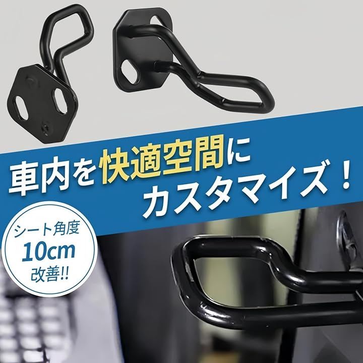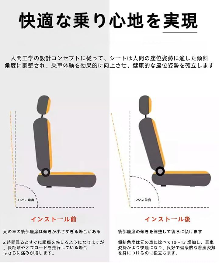 「リアシートの快適性を約10°アップ」 垂直に近い純正ストライカーを約10°の傾斜角に変更。