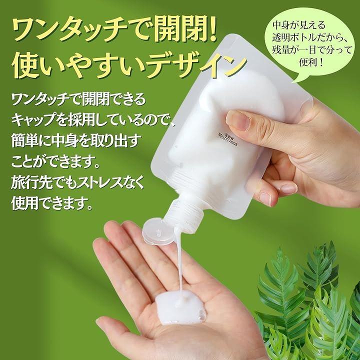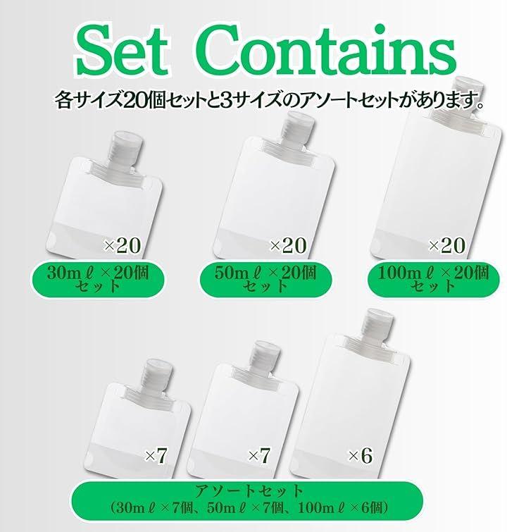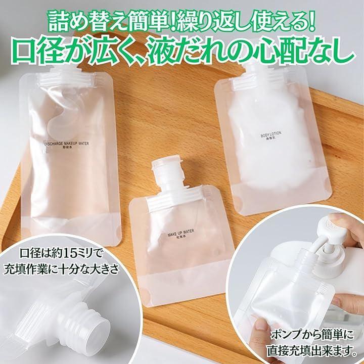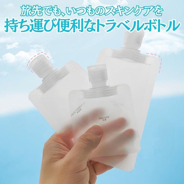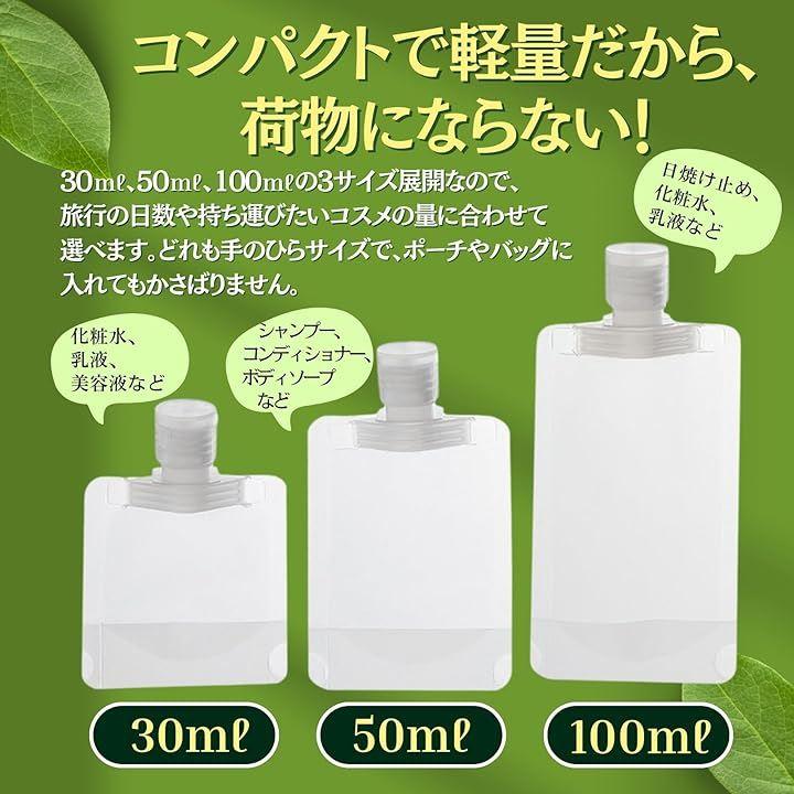 v 荷物スッキリ。軽くて持ち運びやすい 30ml、50ml、100mlの3サイズで、シャンプー、リンス、化粧水、ボディソープなど、あらゆる旅の必需品を無駄なく持ち運べます。