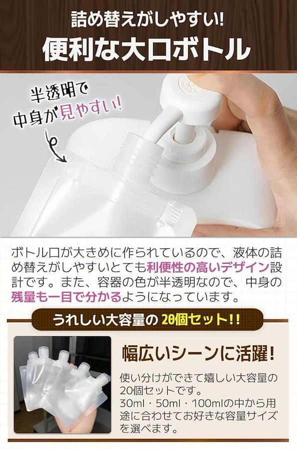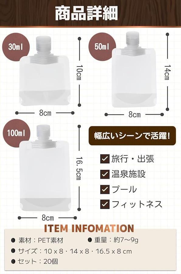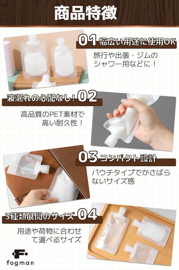 「商品特徴」(1)幅広い用途に使用OK:旅行や出張・ジムのシャワー用などに。/(2)液漏れの心配なし.:高品質のPET素材で高い耐久性。/(3)コンパクト設計:パウチタイプでかさばらないサイズ感/(4)3種類展開のサイズ:用途や荷物に合わせて選べるサイズ