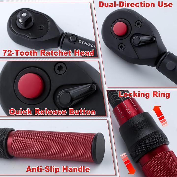 安全性と信頼性: プリセットトルク値に達すると、item.Thisプロフェッショナルトルクレンチを損傷から過度のトルクを防ぐために力を発揮することを停止することを思い出させるために「カチッ」という音が鳴ります素早くスリーブを着脱するために頭のクイックリリースボタンを装備し、それが落ちるのを防ぐためにしっかりとスリーブを保持します。