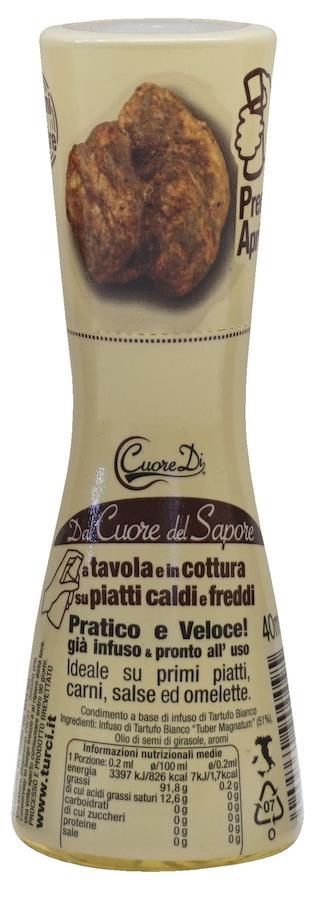 トリュフから抽出した成分にひまわり油を加えたスプレーです。オムレツ、パスタ料理、きのこのリゾットの仕上げに。手軽なスプレータイプ。1915年にブロス(スープの素)やハーブを使用した調味料をつくるファミリー企業として創業しました。長い歴史を持ちながらも現代の最新技術を積極的に取り入れ、原料のエキスを抽出しスプレーボトルに詰めた革新的な製品が生まれました。キッチンでの「料理の仕上げ」や食卓テーブルで「最後に香りづけにひと吹き」と使う場所、使い方が幅広く、イタリア国内に導入以来多くの消費者に支持され、現在では多くの国に輸出されて世界のニーズに最新技術で応えています。