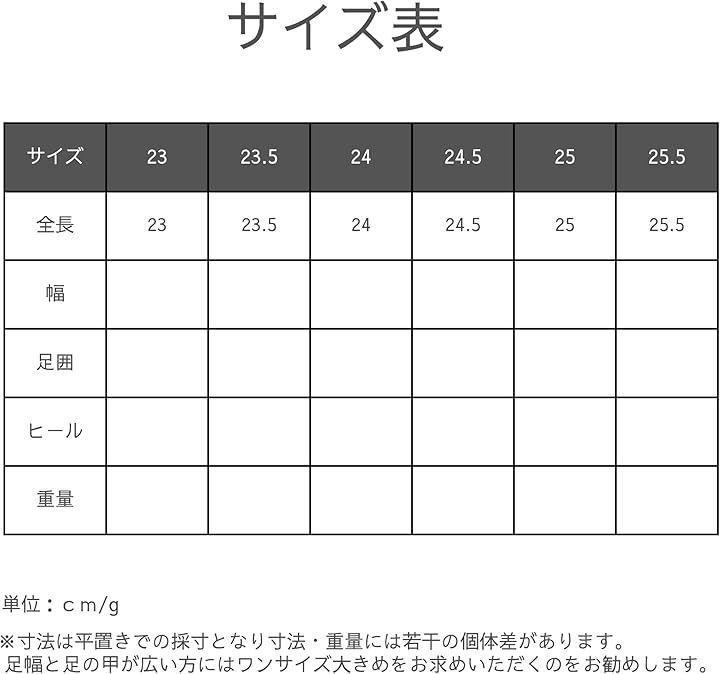 サイズ:(23)全長:23cm 幅: 足囲: ヒール: 重量: (23.5)全長:23.5cm 幅: 足囲: ヒール: 重量: (24)全長:24cm 幅: 足囲: ヒール: 重量: (24.5)全長:24.5cm 幅: 足囲: ヒール: 重量: (25)全長:25cm 幅: 足囲: ヒール: 重量: (25.5)全長:25.5cm 幅: 足囲: ヒール: 重量:*寸法は平置きでの採寸となり寸法・重量には若干の個体差があります。