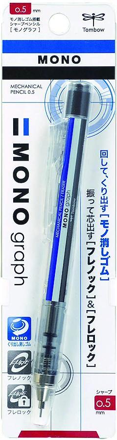 ●仕様:「モノ消しゴム」搭載のシャープペンシル。高精度の「書く」と「消す」を1本で実現。パック入り。◆材質:軸:アクリル樹脂、先端:金属、グリップ・クリップ:ポリカーボネート樹脂◆本体サイズ:最大幅10×全長147mm◆本体重量:17g◆機構:フレノック式(ロック機能付き)、クリップノック式 ◆回転繰り出し式消しゴム付き(MONO品質) ◆製図仕様のペン先 ◆パック仕様 ◆芯径:0.5mm◆替え消しゴム:ER-MG
